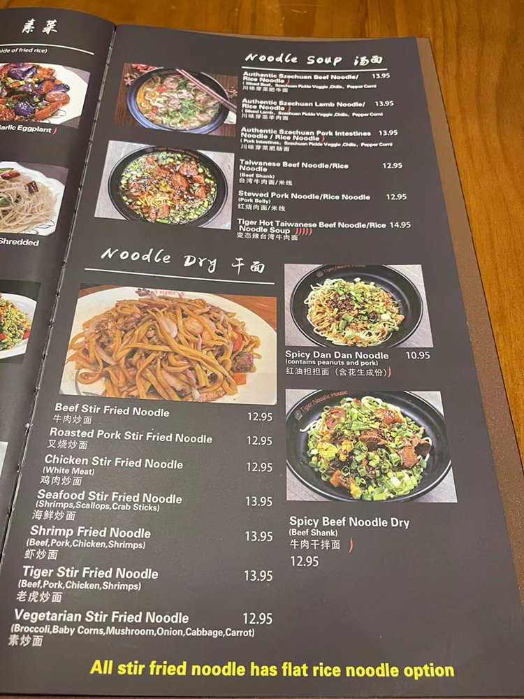 At Tiger’s, you can indulge in a variety of flavorful options, from the spicy Dan Dan Noodles to the savory Classical Dongpo Pork. Their extensive menu also caters to vegetarians, featuring delightful dishes like Bok Choy with Winter Mushroom and Sweet Garlic Eggplant. With prices ranging from $11.95 to $19.95, there's something for everyone.